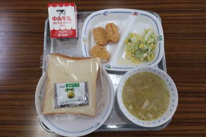 9/3 今日の給食 公開日 2025/09/04 更新日 2025/09/04 特別活動 今日の献立は ————— 大麦と野菜のスープ、コーンサラダ、チキンナゲット、スライスパン、ラ・フランスジャム、牛乳 でした。 *エネルギー:829kcal たんぱく質:27.3g