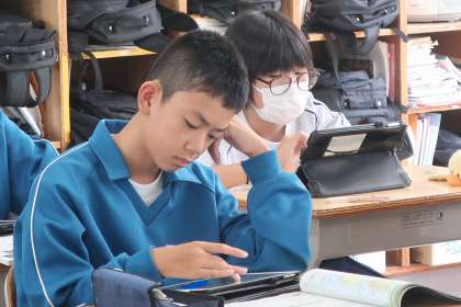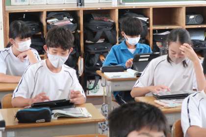 「アジア州の特徴を読み取ろう」をテーマに、学習用タブレットを用いて、その特徴を洗い出していました。
