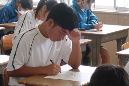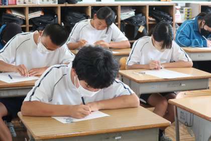 「連立方程式」の単元のまとめのテストに取り組んでいました。来週の定期テストを意識し、また、夏休中の学習の成果を確かめています。