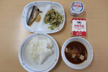 豚汁、いわしのしょうが煮、アーモンドあえ、ヨーグルト、ごはん、牛乳 でした。