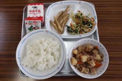 9/11 今日の給食 公開日 2025/09/11 更新日 2025/09/11 特別活動 今日の献立は ————— 高野豆腐のうま煮、わかさぎのから揚げ、おひたし、ふりかけ(野菜と雑穀)、ごはん、牛乳 でした。 *エネルギー:787kcal たんぱく質:31.7g