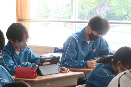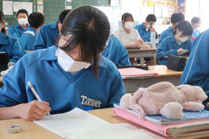 9/8 3-3 自分の考えも英文で… 2 公開日 2025/09/08 更新日 2025/09/08 各学年から 3年3組の英語の授業の様子です。 教科書に掲載されている英語の長文の読解です。同時に、自分の考えを英語で書き出す活動にも取り組んでいました。