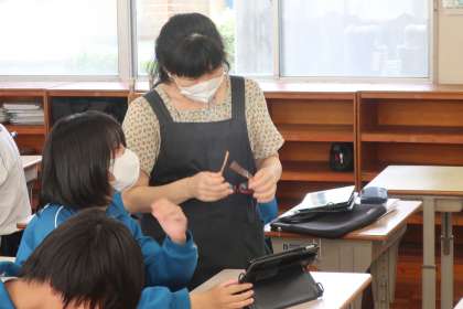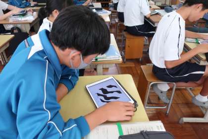 オノマトペ(平面色彩構成)の作品作りに向け、「条件に合わせたデザインを考えよう」をテーマにアイデアをタブレットで表現しながら活動に取り組んでいました。