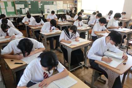 9/10 3-3 第2回定期テスト(1日目) 公開日 2025/09/10 更新日 2025/09/10 各学年から 本日から3日間の日程で始まった第2回定期テスト。 写真は、3年3組の様子です。 来春の進路実現に向け、悔いの残らない取組をしてほしいと思います。