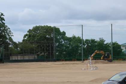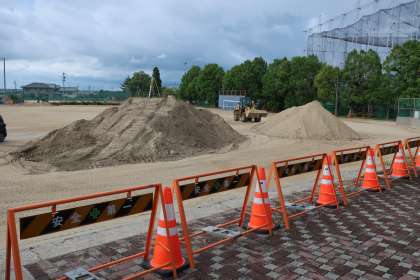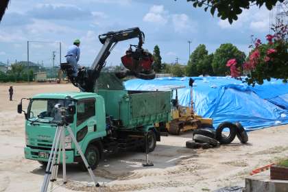 ソフトボール場付近に埋めれらていたトレーニング用のタイヤが運び出されていきます。