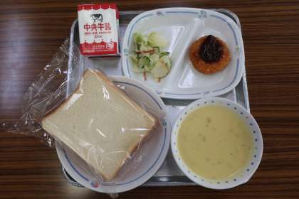 コーンクリームスープ、えびカツサンド、りんごサラダ、スライスパン、牛乳 でした。