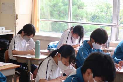 定期テストが返却され、改めて問題を解き直していきます。正解できなかった原因を丁寧に確かめ、受験本番に向けての意識も高めていました。