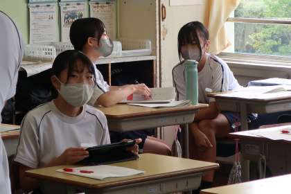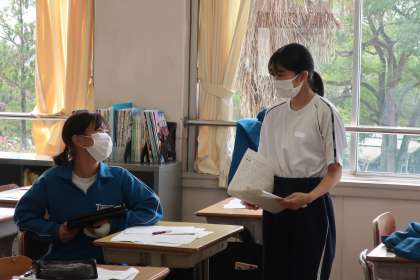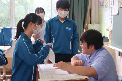 定期テストが返却され、理解が不十分だった問題に再チャレンジしていました。解き方をしっかり身につけようと、教科担任や仲間に確認していました。