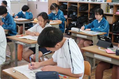 定期テストが返却され、その解説が行われていました。今後のテストに対応できるよう、解き方のポイント、学習とどう結び付けて解答するかなどが確認されていました。