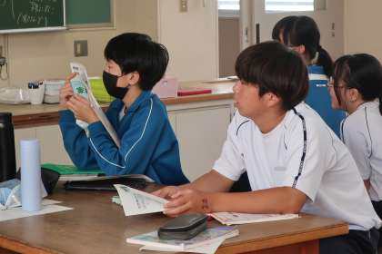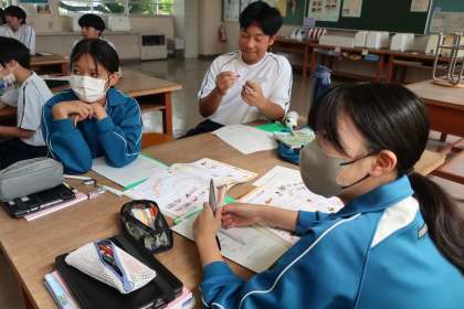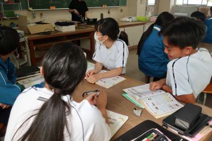 「魚を食べると頭がよくなるってホント?」をテーマに学習が進められていました。その後、次回取り組む生魚のさばき方について、模型を使って予習をしていました。