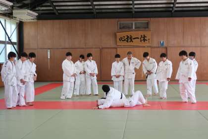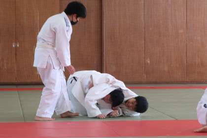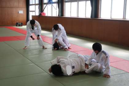 相手の防御を崩して寝技に持ち込む方法を学んでいました。OBの高校生も一緒に指導に当たってくれていました。