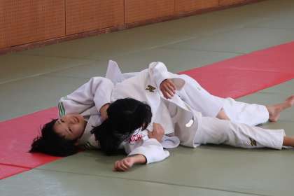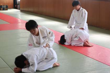 相手の防御を崩して寝技に持ち込む方法を学んでいました。OBの高校生も一緒に指導に当たってくれていました。
