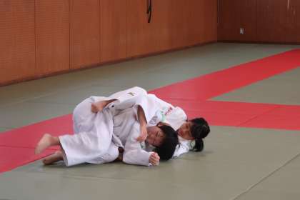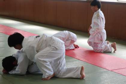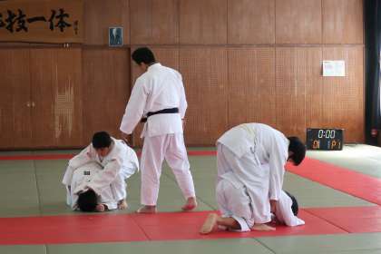 相手の防御を崩して寝技に持ち込む方法を学んでいました。OBの高校生も一緒に指導に当たってくれていました。