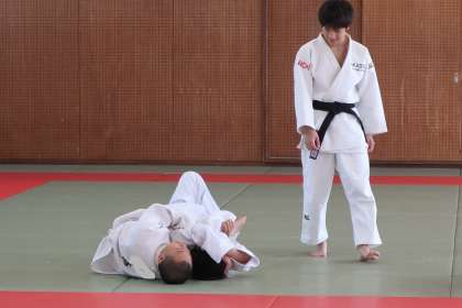 相手の防御を崩して寝技に持ち込む方法を学んでいました。OBの高校生も一緒に指導に当たってくれていました。
