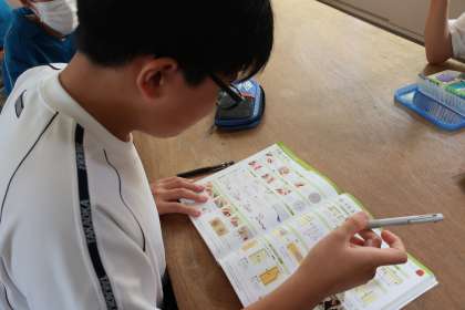 手縫いの方法を学ぶため、糸を針に通し、玉結びを作る練習に取り組んでいました。写真のポーズは、「ウサイン・ボルトのポーズ」。糸の長さを決めるために行っていたものです。