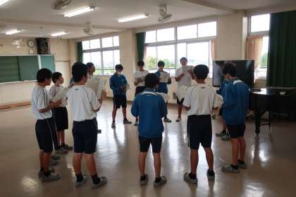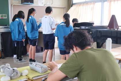 クラスの合唱曲「地球星歌」のパート練習に取り組んでいました。学級の練習時間を充実させようと、担任も必死にメモを取っていました。