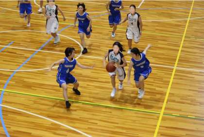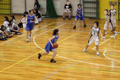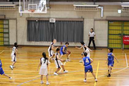 写真は、朝日丘中学校で開催されたバスケットボールの大会の様子です。