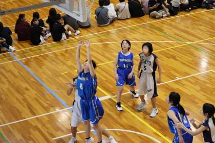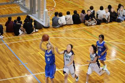 写真は、朝日丘中学校で開催されたバスケットボールの大会の様子です。