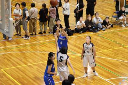 写真は、朝日丘中学校で開催されたバスケットボールの大会の様子です。