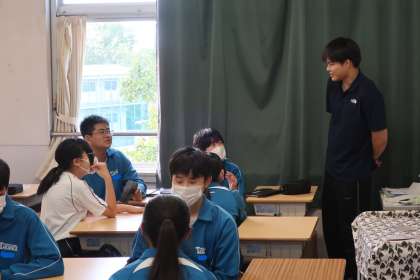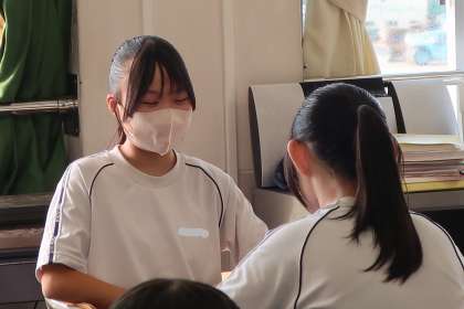 「1分間スピーチ」に取り組んだ今回のポイントは「語尾まではっきりと話す」で、ペアになり、相手の話に熱心に耳を傾けていました。