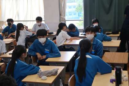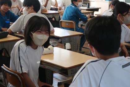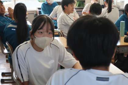「1分間スピーチ」に取り組んだ今回のポイントは「語尾まではっきりと話す」で、ペアになり、相手の話に熱心に耳を傾けていました。