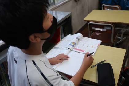 「水溶液の性質をまとめよう」をテーマに、溶質、溶媒、溶液、質量パーセント濃度などの重要語句の意味を確認していました。また、不安の声が出た計算問題にも全員が一生懸命取り組んでいました。