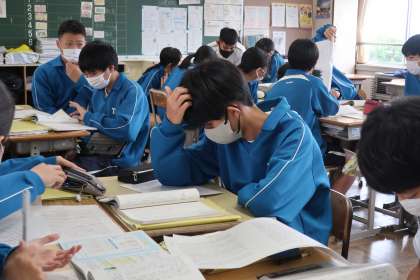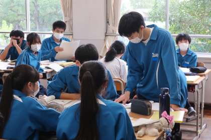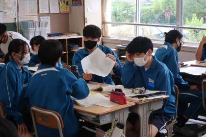 「故郷」の学習で、「井上訳と竹内訳を比べて違いを話し合おう」をテーマに、各自の考えをグループで出し合い、発表していました。