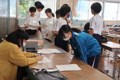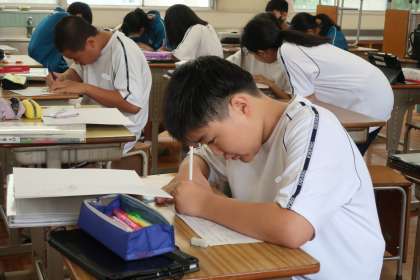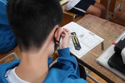 レタリングの学習で、「正しく肉付けしよう」をテーマに基本の文字の練習に取り組んでいました。