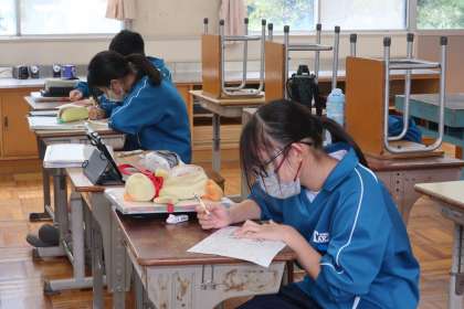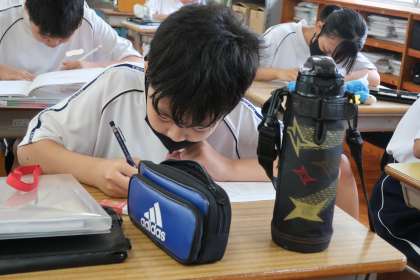 レタリングの学習で、「正しく肉付けしよう」をテーマに基本の文字の練習に取り組んでいました。