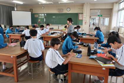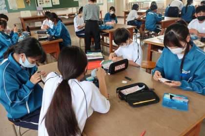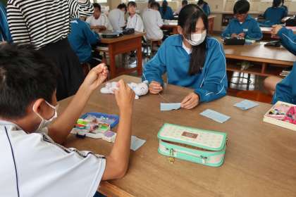 「一人で縫い準備ができるようになろう」をテーマに裁縫の基本を学んでいました。活動の中で、「玉結びマスター」なるものに推薦された生徒の誇らしい顔が印象的でした。