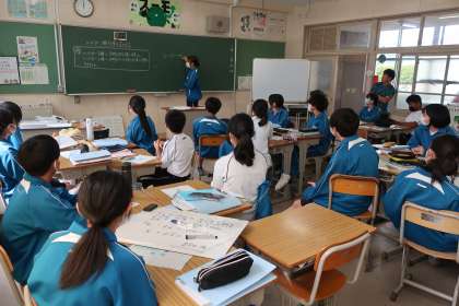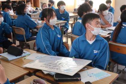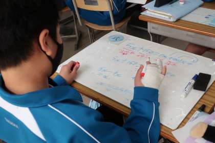 「ハンバーガー1個の代金を求めよう」をテーマに、方程式に表すまでの考え方をグループで確認し合っていました。