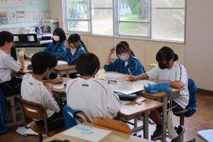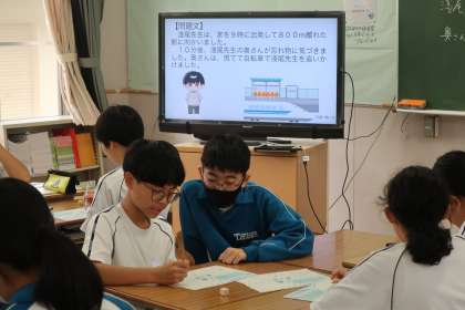 「忘れ物をした先生に、それを届ける奥さんは間に合うか」を問う文章問題で、答えにたどり着く解き方をグループで話し合い、間に合うか・間に合わないかを導き出していました。