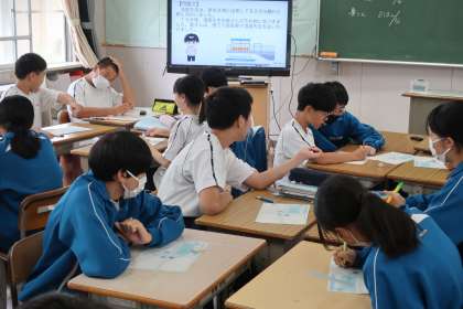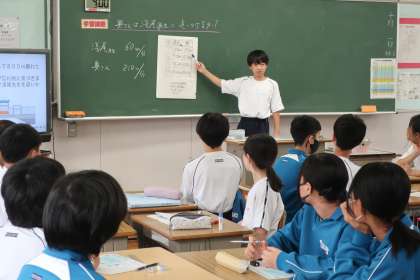 10/3 1-1 間に合うか・間に合わないか 4 公開日 2025/10/03 更新日 2025/10/03 各学年から 1年1組の数学の授業の様子です。 「忘れ物をした先生に、それを届ける奥さんは間に合うか」を問う文章問題で、答えにたどり着く解き方をグループで話し合い、間に合うか・間に合わないかを導き出していました。