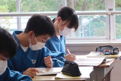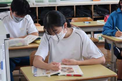 10/3 3-5 いにしえの心を受け継ぐ 4 公開日 2025/10/03 更新日 2025/10/03 各学年から 3年5組の国語の授業の様子です。 「いにしえの心を受け継ぐ」の学習で、「三つの歌集(万葉集、古今和歌集、新古今和歌集)について知り、仮名序の音読を楽しもう」をテーマに学習が進められていました。