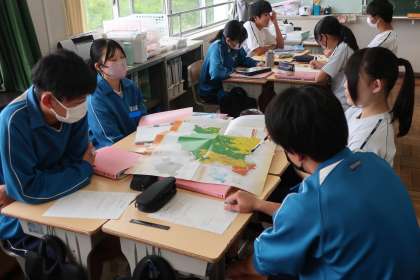 「豊田市在住の外国人に向けて、防災に関するパンフレットを作ろう」をテーマに、実際に豊田市で配布されているパンフレットを参考にしながら、内容や構成のアイデアをグループで出し合っていました。