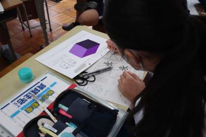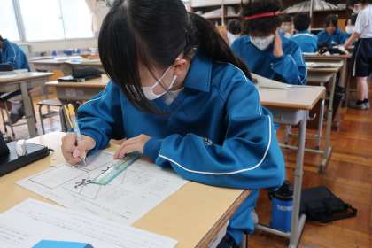 レタリングの学習で、「正しく肉付けしよう」をテーマに基本の文字の練習に取り組んでいました。