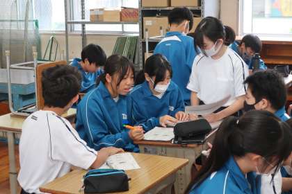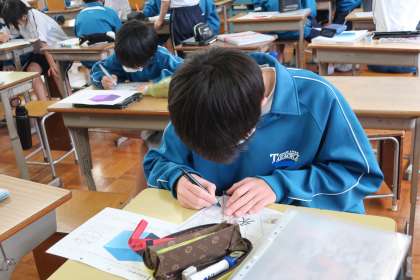 レタリングの学習で、「正しく肉付けしよう」をテーマに基本の文字の練習に取り組んでいました。