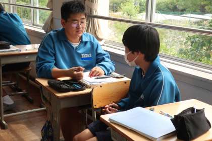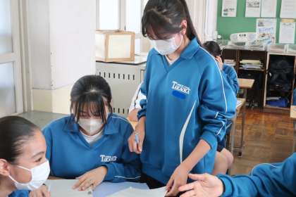 二次関数の学習で、「yの変域を求めよう」をテーマに演習問題を通して、仲間と解き方の確認を行っていました。