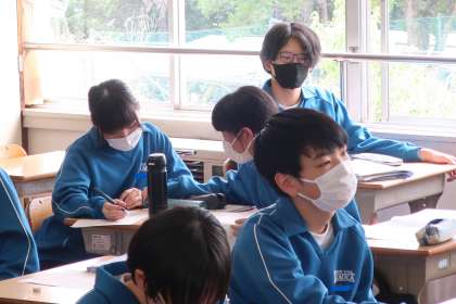 二次関数の学習で、「yの変域を求めよう」をテーマに演習問題を通して、仲間と解き方の確認を行っていました。