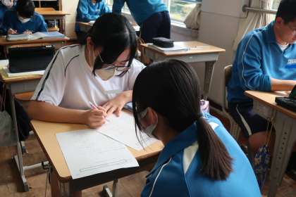 二次関数の学習で、「yの変域を求めよう」をテーマに演習問題を通して、仲間と解き方の確認を行っていました。