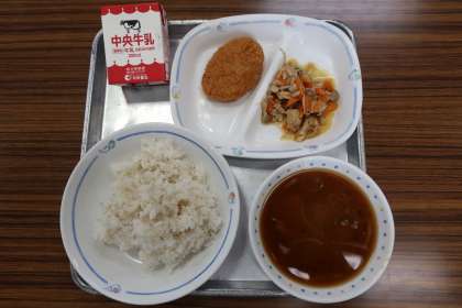 さつまいものみそ汁、きのこごはん(麦ごはん)、かつおのミンチカツ、牛乳 でした。