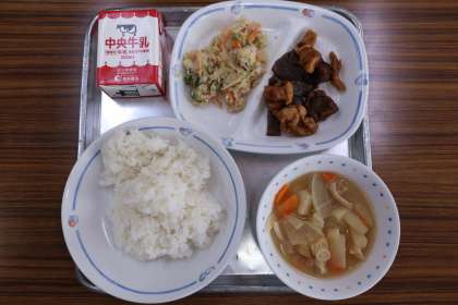 10/8 今日の給食 公開日 2025/10/08 更新日 2025/10/08 特別活動 今日の献立は ————— 麦みそ汁、和風サラダ(和風ドレッシング)、レバーとこんにゃくの甘辛煮、ごはん、牛乳 でした。 *エネルギー:849kcal たんぱく質:27.7g