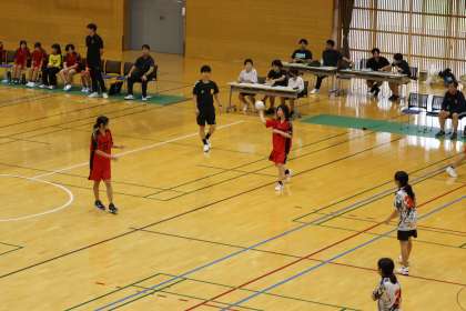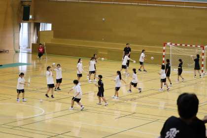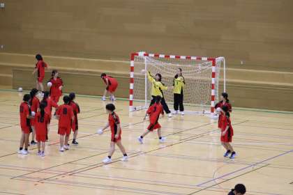 写真は、スカイホール豊田で開催された女子ハンドボールの大会の様子です。