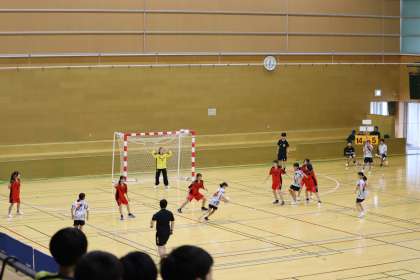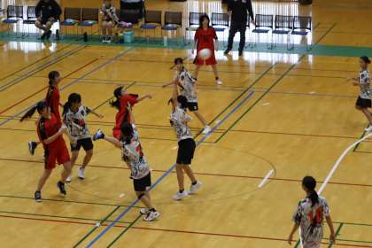 写真は、スカイホール豊田で開催された女子ハンドボールの大会の様子です。