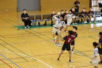 写真は、スカイホール豊田で開催された男子ハンドボールの大会の様子です。