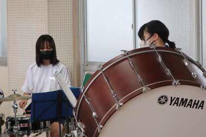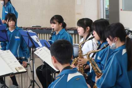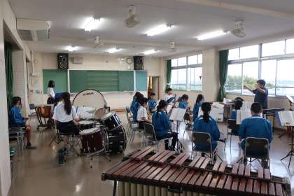 全員が一つの教室に集まっての活動です。1年生が先輩の演奏の様子を見る目が真剣です。