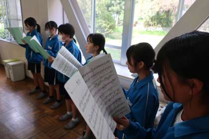 現在、朝の活動時、給食後、授業後など、時間を自分たちで作り出して合唱練習に励んでいます。