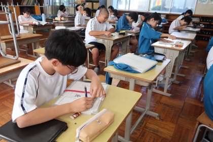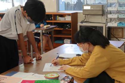 レタリングの学習で、「正しく肉付けしよう」をテーマに、基本の文字の作品を完成させるよう取り組んでいました。