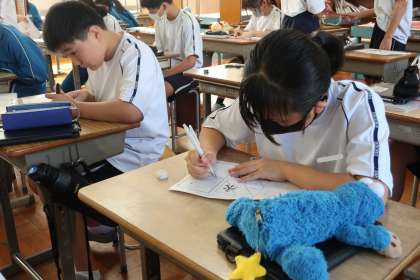 レタリングの学習で、「正しく肉付けしよう」をテーマに、基本の文字の作品を完成させるよう取り組んでいました。