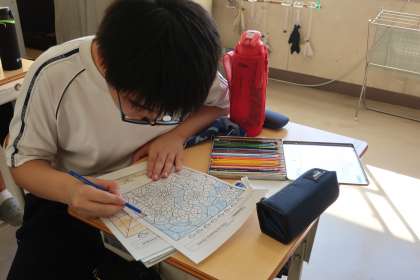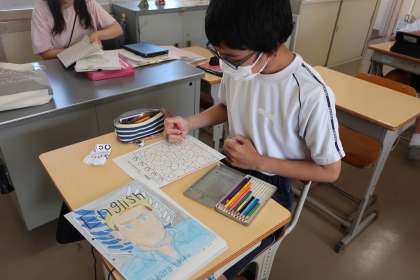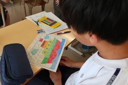 英語で示された色を読み取り、イラストに色を塗っていきます。次第に指示も細かく、デザインも複雑になっていきますが、根気よく取り組んでいました。